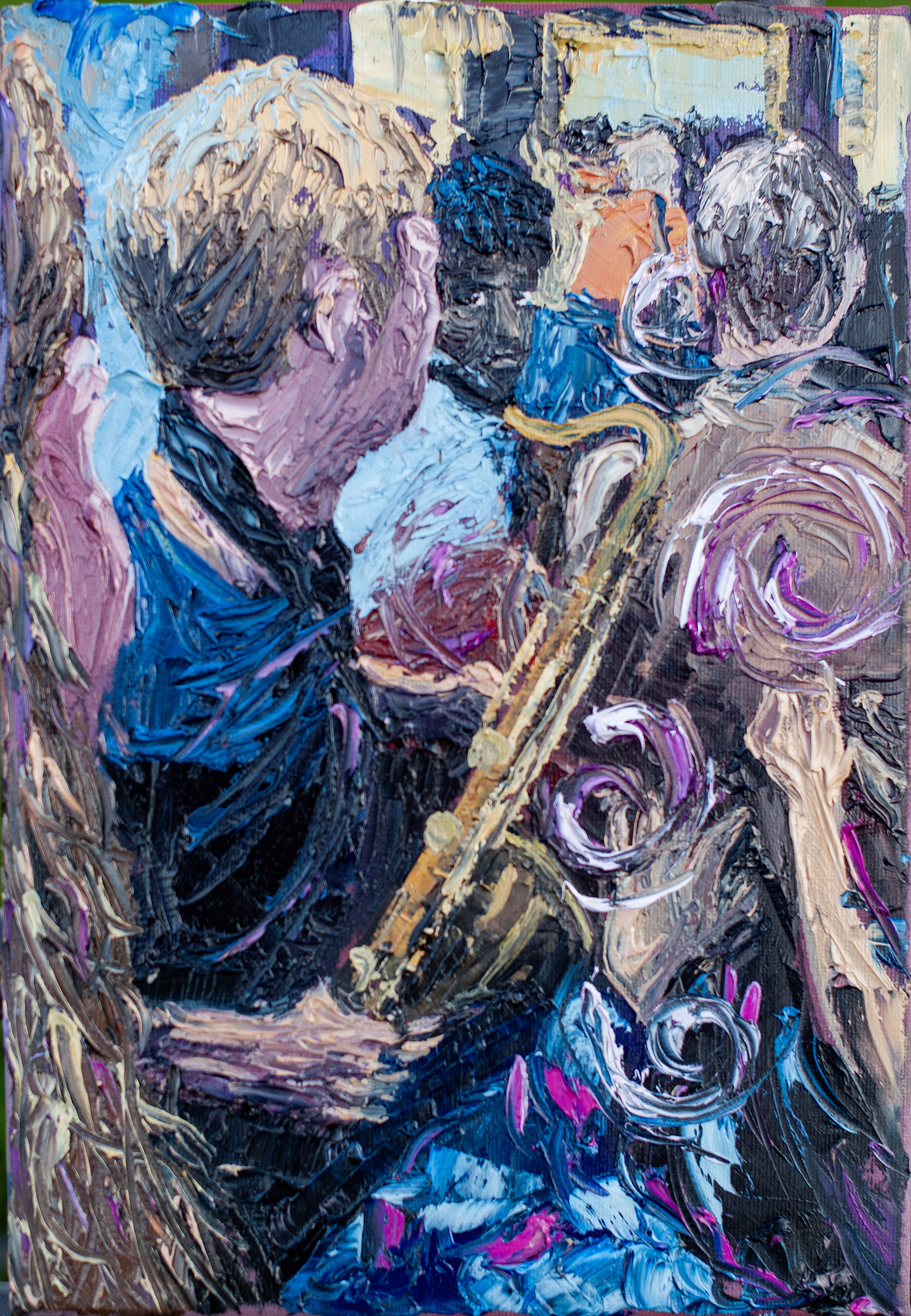 This painting was inspired by an event in October 2021, the ‘Wild Paths’ festival in Norwich. Things were gradually getting back to normal following the COVID-19 lockdowns, and this was one of the first events where things started to feel a little normal again. I had gone up to see my son play and made a mistake with the car park and got my car locked in. I had to stay the night unexpectedly, so I went back to the pub and the party was in full swing. The appreciation of the joy and love of live music was evident from all the young people there.